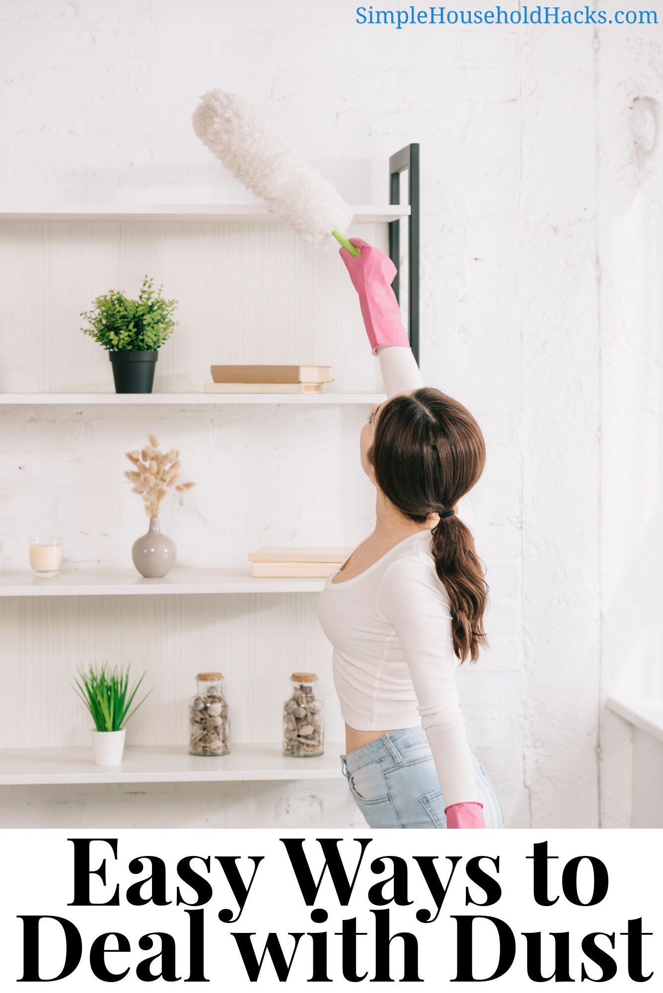 Tips for dealing with household dust include changing linens, cleaning up dust rather than spreading it, dusting top to bottom, replacing filters, and minimizing clutter.